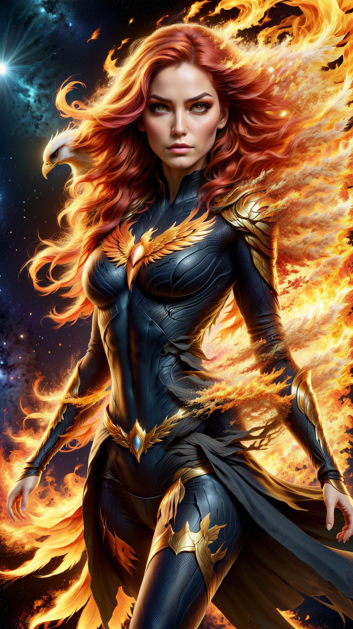 Phoenix/Jean Grey in her Phoenix costume, but it's dark black with metallic gold, a golden fiery falcon symbol on the front of her costume, the sash around her waist blowing in the cosmic winds. She is surrounded by her fiery Phoenix raptor/falcon aura, she is within the firebird . Her eyes are lit up like stars. Her hair is beautiful red flames, flaring out. Full body pose. She is in space, on the edge of a galaxy.