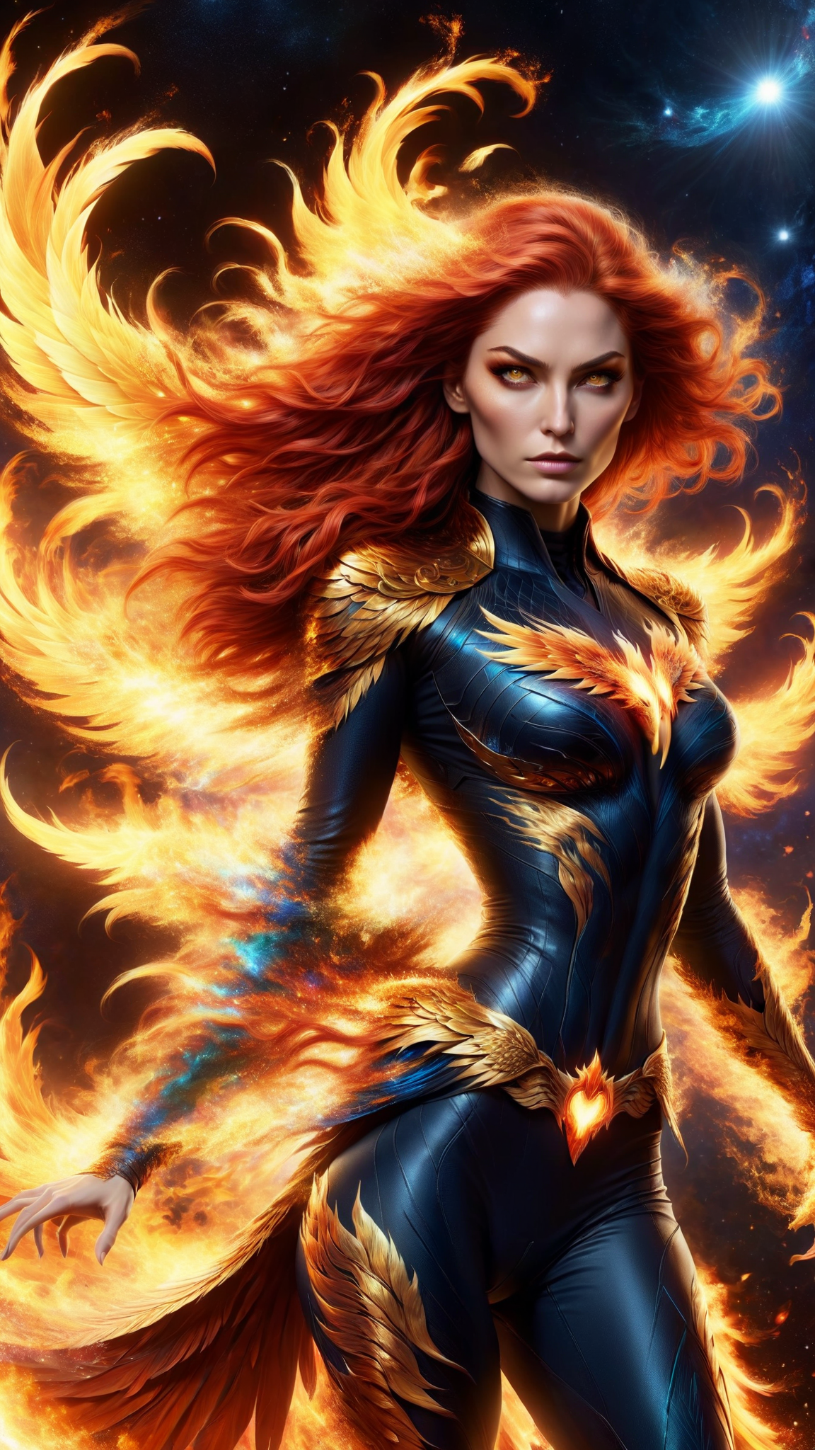 Phoenix/Jean Grey in her Phoenix costume, but it's dark black with metallic gold, a golden fiery falcon symbol on the front of her costume, the sash around her waist blowing in the cosmic winds. She is surrounded by her fiery Phoenix raptor/falcon aura, she is within the firebird . Her eyes are lit up like stars. Her hair is beautiful red flames, flaring out. Full body pose. She is in space, on the edge of a galaxy.