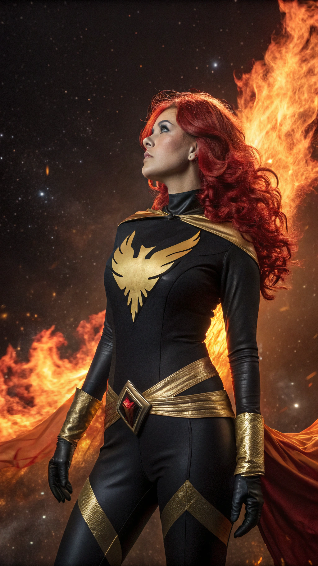 Phoenix/Jean Grey in her Phoenix costume, but it's dark black with metallic gold, a golden fiery falcon symbol on the front of her costume, the sash around her waist blowing in the cosmic winds. She is surrounded by her fiery Phoenix raptor/falcon aura, she is within the firebird . Her eyes are lit up like stars. Her hair is beautiful red flames, flaring out. Full body pose. She is in space, on the edge of a galaxy.