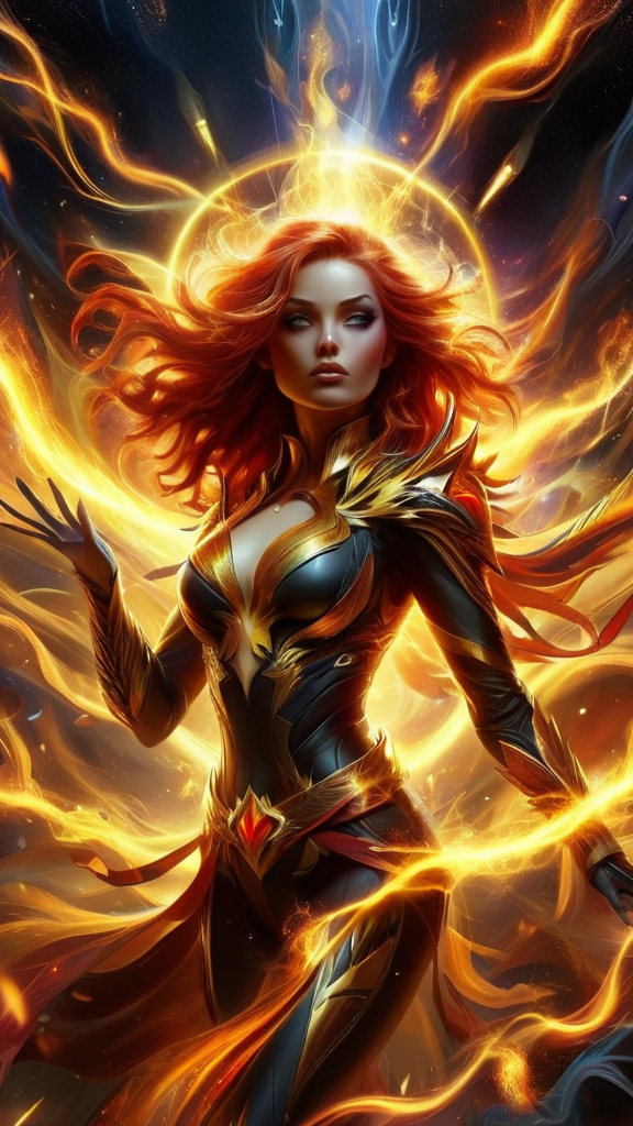 Phoenix/Jean Grey in her Phoenix costume, but it's dark black with metallic gold, a golden fiery falcon symbol on the front of her costume, the sash around her waist blowing in the cosmic winds. She is surrounded by her fiery Phoenix raptor/falcon aura, she is within the firebird . Her eyes are lit up like stars. Her hair is beautiful red flames, flaring out. Full body pose. She is in space, on the edge of a galaxy.