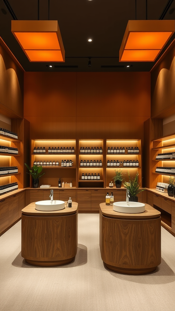 Photo, a minimalist Aesop-branded store interior with an elegant mix of warm, indirect lighting and striking orange-colored square fixtures as main lights. The walls exude warmth with a soft bronze finish, complementing the beige carpeted floor. Products are meticulously arranged on custom-designed wooden wall displays and central Irish islands, which feature graceful curved wood detailing. These islands incorporate sleek faucets and sinks, adding a touch of modern sophistication. Minimalist plant arrangements are thoughtfully positioned to enhance the ambiance and balance shadows. The overall design emphasizes understated elegance and meticulous attention to detail, captured in stunning ultra-high definition, aspect ratio 16:9.