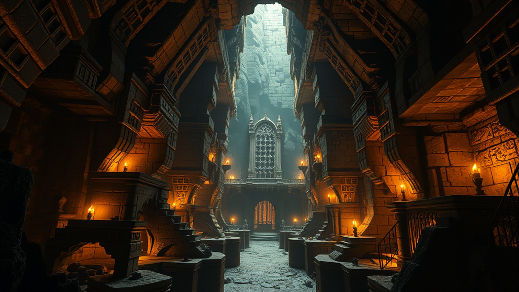 Photo captures an epic and intricate labyrinth within the Mines of Moria, blending brutalist architecture with dark fantasy elements, showcasing colossal stone structures and intricate carvings illuminated by flickering torchlight shadows.