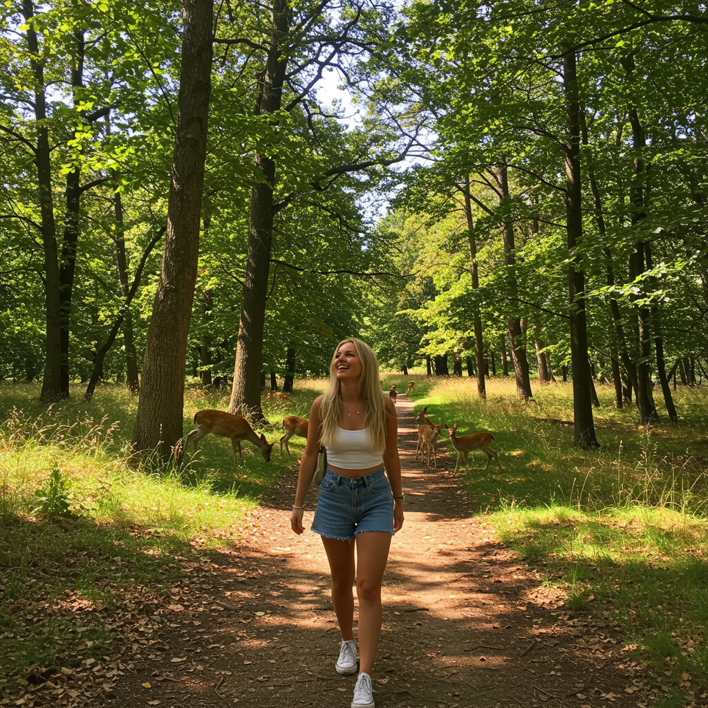 A vibrant photo capturing a blonde Instagram influencer joyfully exploring a lush, sun-dappled forest trail on a warm, sunny day; her laughter echoes through the towering trees as golden rays dance on her hair, and a gentle breeze whispers past. She pauses to admire a family of deer grazing nearby, her expression a perfect blend of wonder and contentment. The scene is alive with the vivid greens of leaves, the earthy tones of the path underfoot, and the soft blue of the sky peeking through the canopy above, capturing a moment where nature and influencer exist harmoniously.