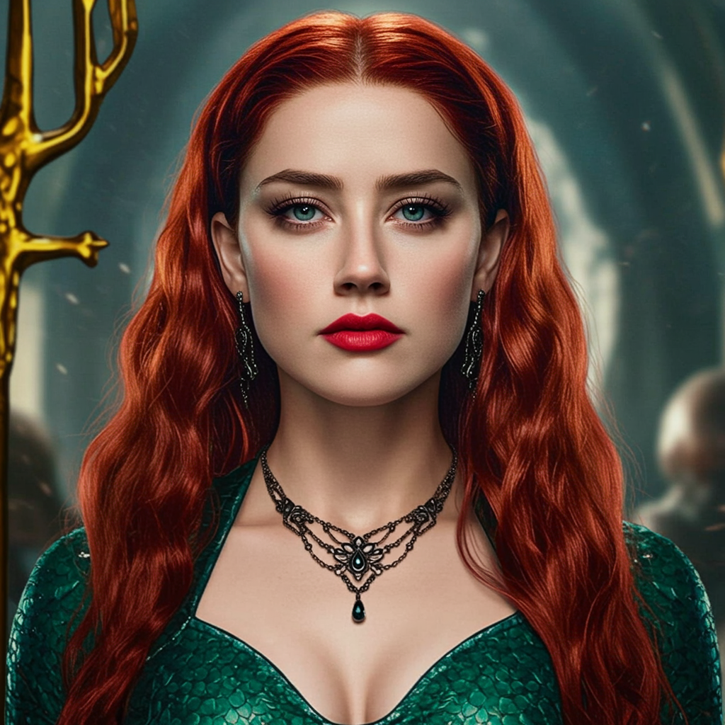 A realistic photo of Amber Heard dressed as Mera in 8k resolution, emphasizing a striking and captivating appearance. Her costume is detailed and reminiscent of Mera's iconic look, with elegant jewelry including a gothic necklace and earrings. Her hair, styled with soft curls and subtle shadows, frames her face perfectly. While the background is softly blurred to highlight Amber, the image maintains high quality with no visible artifacts or distortions. With an emphasis on vibrant colors and realistic textures, the overall composition showcases a stunning portrayal, avoiding any low-quality or distracting elements.