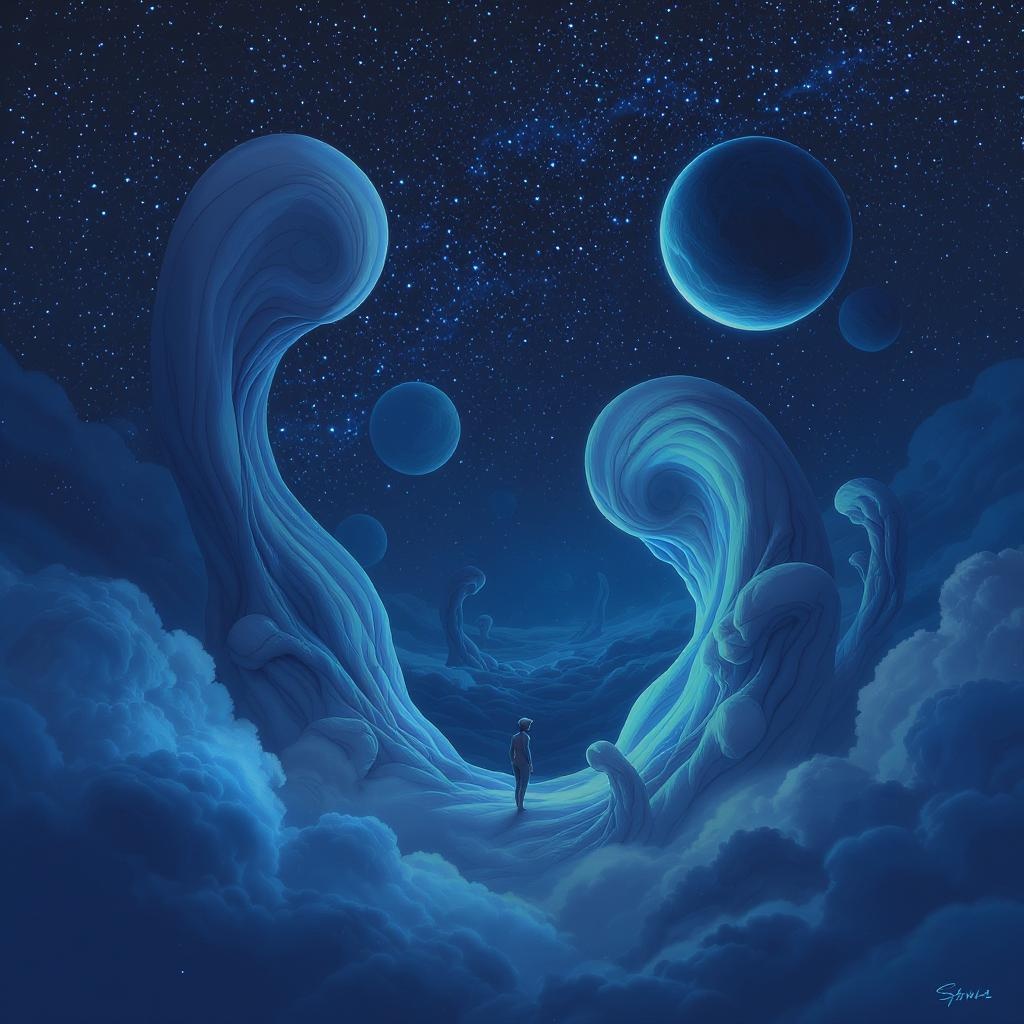 Photo illustration depicting an ethereal world nestled among the clouds, inspired by the style of Tanya Shatseva, The Stars Art Group, and Meghan Howland, blending dark indigo with hints of light cyan. This scene features mind-bending sculptures that defy conventional shapes, all captured with realistic hyper-detail and fluid simplicity, offering a surreal and mesmerizing atmosphere.
