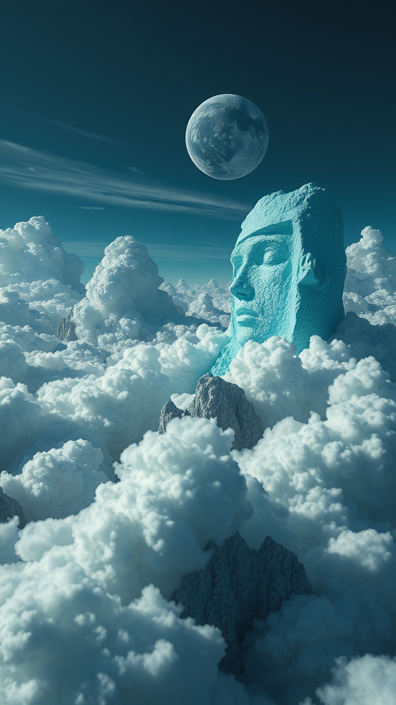 Photo illustration of a surreal world nestled in the clouds, portraying dreamlike landscapes in the style of Tanya Shatseva and The Stars Art Group with influences from Meghan Howland. The scene is bathed in dark indigo and light cyan hues, with mind-bending sculptures seamlessly integrated into the environment. The composition features realistic hyper-detail, juxtaposed with fluid simplicity, conveying an ethereal and otherworldly atmosphere. The visual grandeur is further enhanced with a tall cinematic aspect ratio of 63:128, offering an immersive experience with a stylized touch.