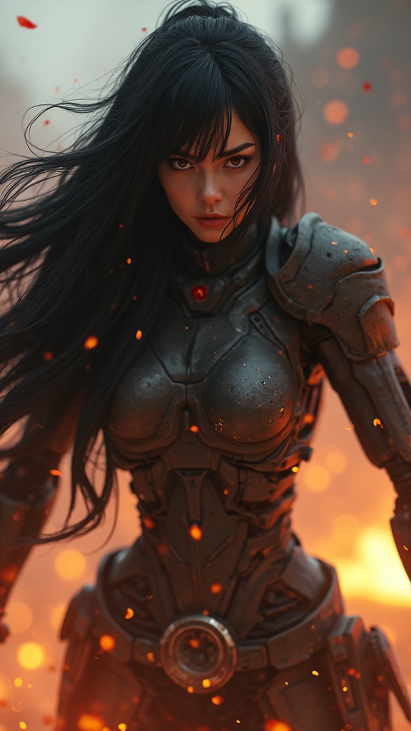 View this AI-generated image featuring photo of a fierce mecha girl with long flowing black hair displaying an intense expression preparing for battle in a dynamic stance the scene is richly detailed with hdr and ultra high detail capturing the intensity surrounded by glowing fire embers and a soft