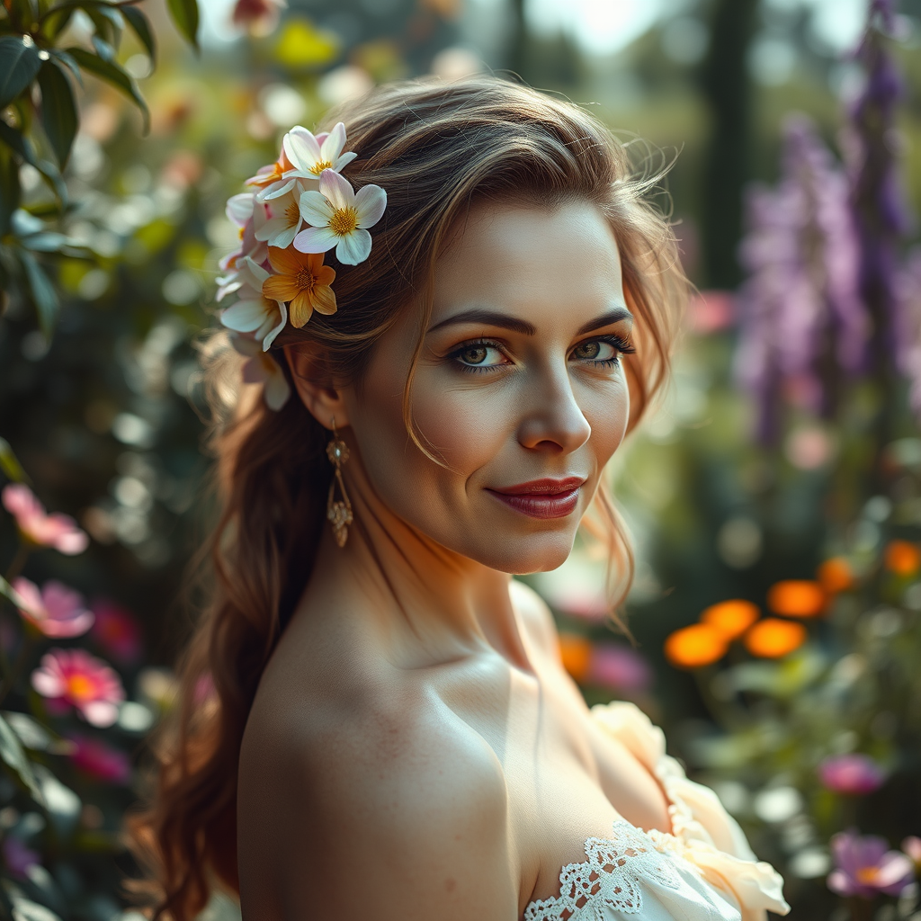 Photo of a 40-year-old woman with a relaxed physique, adorned with flowers in her hair, set against an ethereal garden backdrop. The portrait draws inspiration from Anna Dittmann's fantasy art, featuring intricate detailing and a photorealistic style. Captured with a Cinestill Hasselblad 85mm lens using a tilt-shift technique, the composition employs a Dutch angle to create drama. The scene is illuminated with soft, studio-quality lighting, highlighting realistic skin textures, subtle subsurface scattering, and pronounced shadow effects. The image achieves hyperrealism with an 8k resolution, adhering to the golden ratio for an aesthetically pleasing layout. The entire composition exudes a sense of elegance and artistry while avoiding visual anomalies such as blurring, distortion, or poor lighting. The focus remains solely on the subject, with extraneous elements and distractions intentionally minimized or excluded.