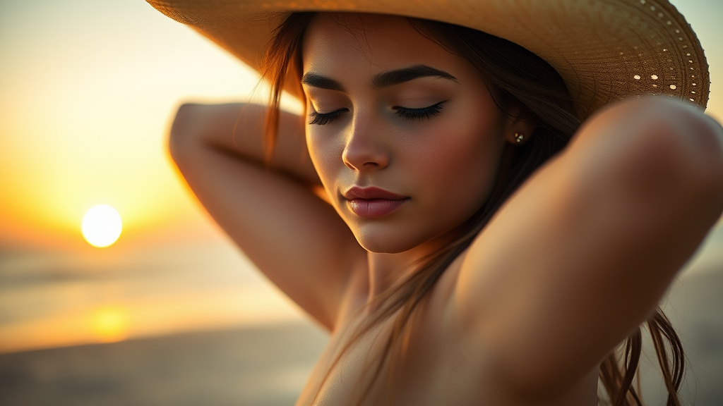 Photo of a beautiful young woman, intricate and elegant, with a fantasy-like appearance, detailed features, and cinematic lighting. The scene captures gradient lighting at sunset on the beach. She is in a cowgirl pose with her arms behind her back, showcasing a cute and finely defined face with closed eyes. This portrait is of the highest quality, a masterpiece captured in ultra high resolution.