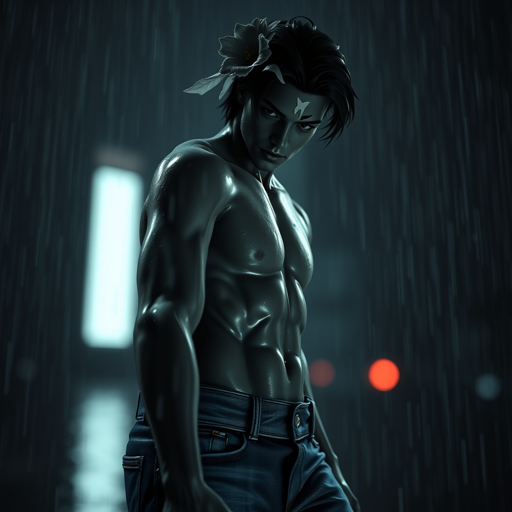 Photo of a breathtaking artwork depicting a glossy male hero in a full-body 8k unity render, captured in action. The piece features skin textures, very dark lighting with heavy shadows, and an intensely detailed face. The style is decadent, reminiscent of digital paintings seen on ArtStation, echoing the influence of artists like Artgerm, WLOP, Ilya Kuvshinov, Greg Rutkowski, and Alphonse Mucha. The scene takes place in atmospheric heavy rain, with floating particles and dim, trimmed, two-tone lighting enhancing the mood. A flower and unique facial marking subtly ornament the hero. He is clad in blue jeans, and the artwork carries a 3D render quality, reminiscent of a smooth doll, with elements of blur, haze, and monochrome effects. Avoiding any distortions or abnormal features, the focus is on clarity and high quality, without any text, logos, or artifacts. The piece exudes a sense of dramatic elegance and sharp focus, intended as concept art.