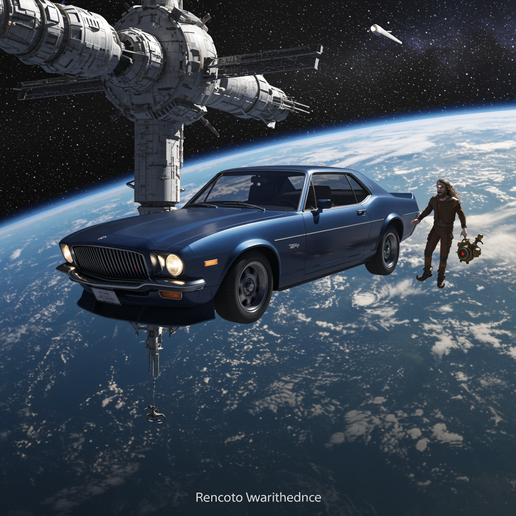 Photo of a car in a weightless state with a dark blue color, approaching a space station against a backdrop of stars and Earth visible from space. The scene is captured in 8K resolution with insane details and a photorealistic style. The composition features a unique spaceship design with awesome perspective, highlighting two people with distinctive features such as one having a long beard and another with pointed footwear. The image should avoid elements like disfigured anatomy, poorly drawn features, or unrealistic proportions, maintaining a clean and cohesive look without distractions like watermarks, text, or blurred aspects. The overall impression is futuristic and imaginative, maintaining clarity and high quality in all areas.