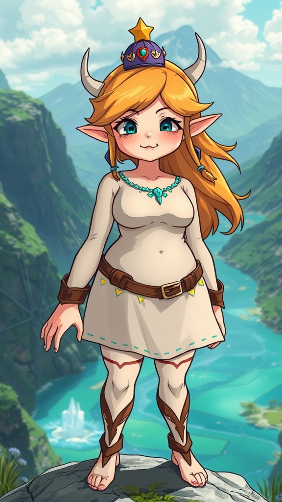 Photo of a charming, pleasantly plump Zelda with a joyful smile, set against a breathtaking natural backdrop, showcasing intricate details and crisp, sharp features; elements of poorly drawn aspects like unusual anatomy and mystical mutations appear subtly, with limbs appearing artistically misaligned, adding an abstract, dreamlike quality, yet maintaining an enchanting and vibrant aesthetic.
