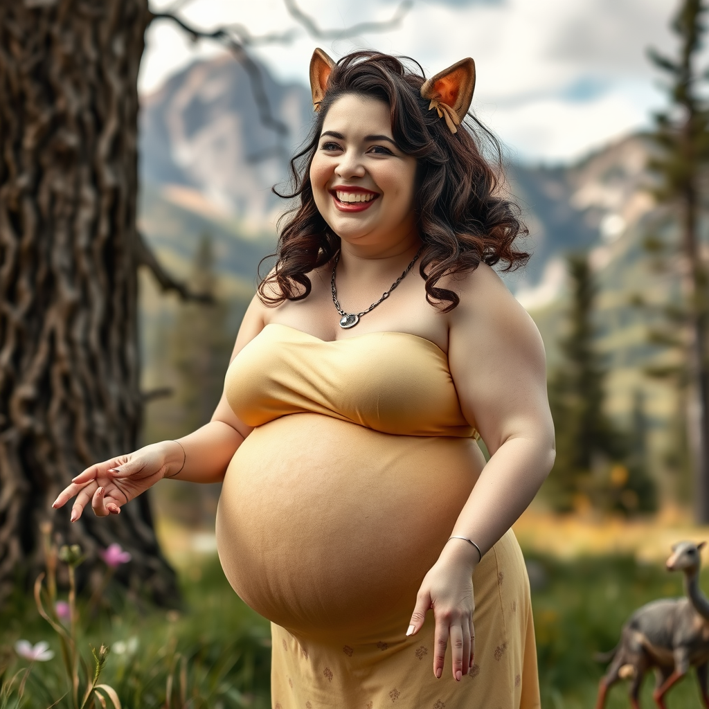 Photo of a charming, plump Zelda with a joyful smile in a professional outdoor setting surrounded by stunning nature, featuring intricate and sharp details while showcasing quirky artistic elements such as playful distortions, unusual anatomy, unexpected limbs, and whimsical mutations, with a blend of classic beauty and abstract artistic interpretation.