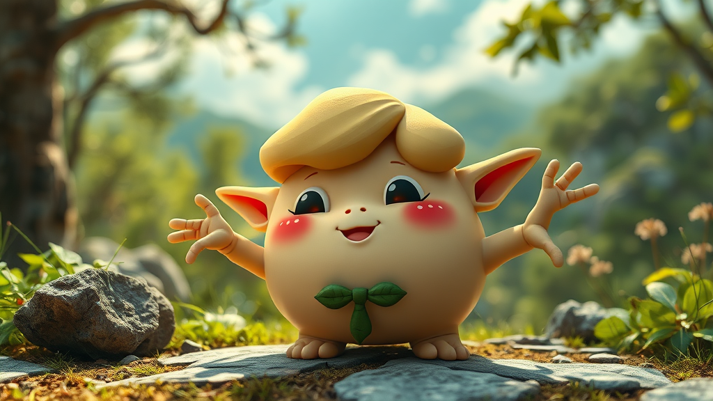 Photo of a cute, cheerful, plump character reminiscent of Zelda in a stunning natural setting, showcasing intricate and detailed features, with HDR quality and crisp sharp details; creatively reimagined with elements of whimsical imperfections, such as unexpected anatomy, playful limbs, and abstract forms, resulting in a visually unique and captivating image with an imaginative twist.