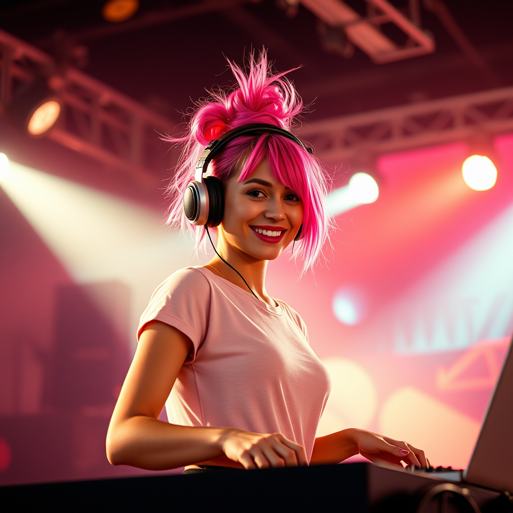 Photo of a female DJ, 24 years old, slender build, vibrant pink hair styled in a messy ponytail, wearing detailed headphones, with a medium smile, standing confidently on a stage under cinematic lighting. The setting is captured in high resolution, featuring professional color grading and film grain for a realistic and vividly clear image. She exudes energy as she plays her music, with an authentic touch of charisma that lights up the scene, ensuring all focus remains on her engaging presence.