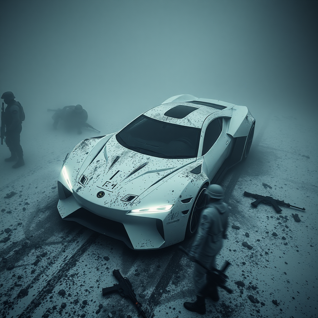 Photo of a futuristic utopian vehicle with white paint, ultra-realistic in an abandoned city setting. There's high contrast between the foggy atmosphere and snowy ground, with mud splattered on the car. LED lights illuminate the scene, highlighting the superb materials of the car. The composition features soldiers on the ground seen from a bird's eye or drone view perspective, capturing a hyperrealistic, hyper-detailed moment. The scene is in an analog style with soft lighting and subsurface scattering for realistic skin textures of the figures present. Matte skin tones and heavy shadows enhance the masterpiece-quality image. It's an 8k resolution photograph with a focus on the golden ratio, demonstrating intricate, high-detail film photography with a large depth of field.