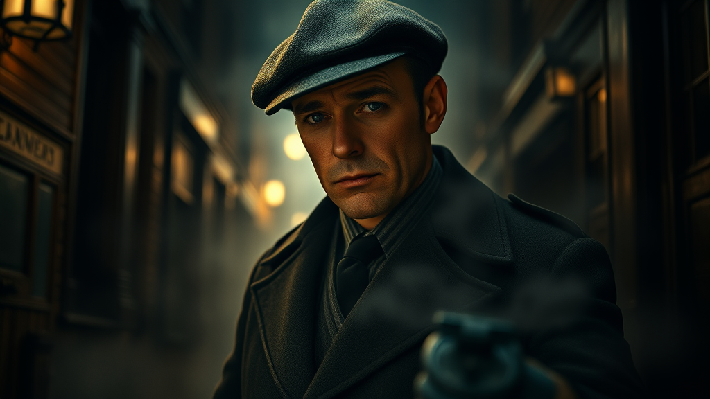 Photo of a gritty, hyperrealistic 1920s British gangster from Peaky Blinders in a dimly-lit, smoke-filled alley, wearing a vintage flat cap and overcoat, vividly detailed facial features, carrying a polished pocket watch, cinematic film grain effect, softly billowing fog creating an aura of mystery.