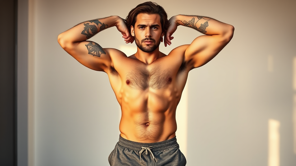 Photo of a handsome Italian man with deep brown hair, notably hairy chest, arms lifted to reveal armpit hair, showcasing toned abs; he's in peak physical condition, donning snug charcoal shorts. He stands confidently in a minimalist room with pristine white walls. His arms are adorned with intricate tattoos, capturing the essence of a full-body snapshot taken during the golden hour, reminiscent of an artistic 2018 Snapchat vibe.