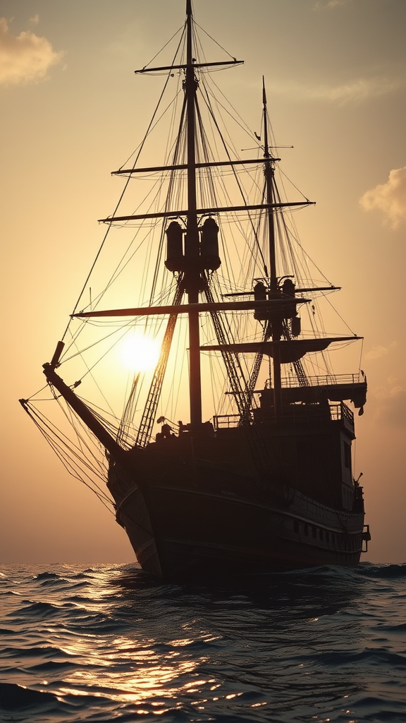 Photo of a hyper-realistic sailing ship, illuminated by dramatic cinematic light at the break of a pale sunrise, showcasing intricate details and textures in an ultra-realistic style. The ship appears weathered and battered by time, captured from a low angle to emphasize its grandeur. The scene evokes an epic and immersive atmosphere, reminiscent of a masterpiece crafted by the combined talents of Studio Ghibli and the intricate brushwork of John William Turner. The image is trending on ArtStation, rendered in exquisite 4k detail, pushing the boundaries of Unreal Engine 5 to achieve an unparalleled level of focus and realism.