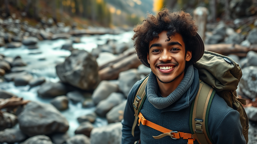 photo of a man outdoors in the mountains wearing a backpack and hiking gear, including a sweater and jacket, surrounded by rocks and a flowing river, with wooden elements nearby, captured in an analog style. The image is a close-up with cinematic lighting, utilizing sidelighting, shot with a Fujifilm XT3 DSLR and 50mm lens. The man has curly hair with an afro and bangs, is smiling, and is wearing a hat. The scene conveys a natural yet cyber-realistic vibe.