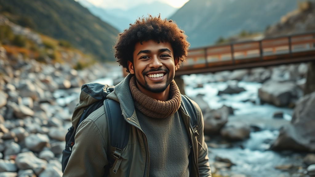 Photo of a man outdoors in the mountains, wearing a backpack, a sweater layered with a hiking jacket, surrounded by rocks and a flowing river. He is standing near a wooden bridge, captured in an analog style with close-up composition. The scene is lit with cinematic sidelighting, mimicking the effect of a Fujifilm XT3 DSLR at 50mm. The man, smiling with curly afro hair and bangs, wears a hat. The image evokes a natural and realistic vibe, subtly enhanced with deep contrast and vibrant colors.