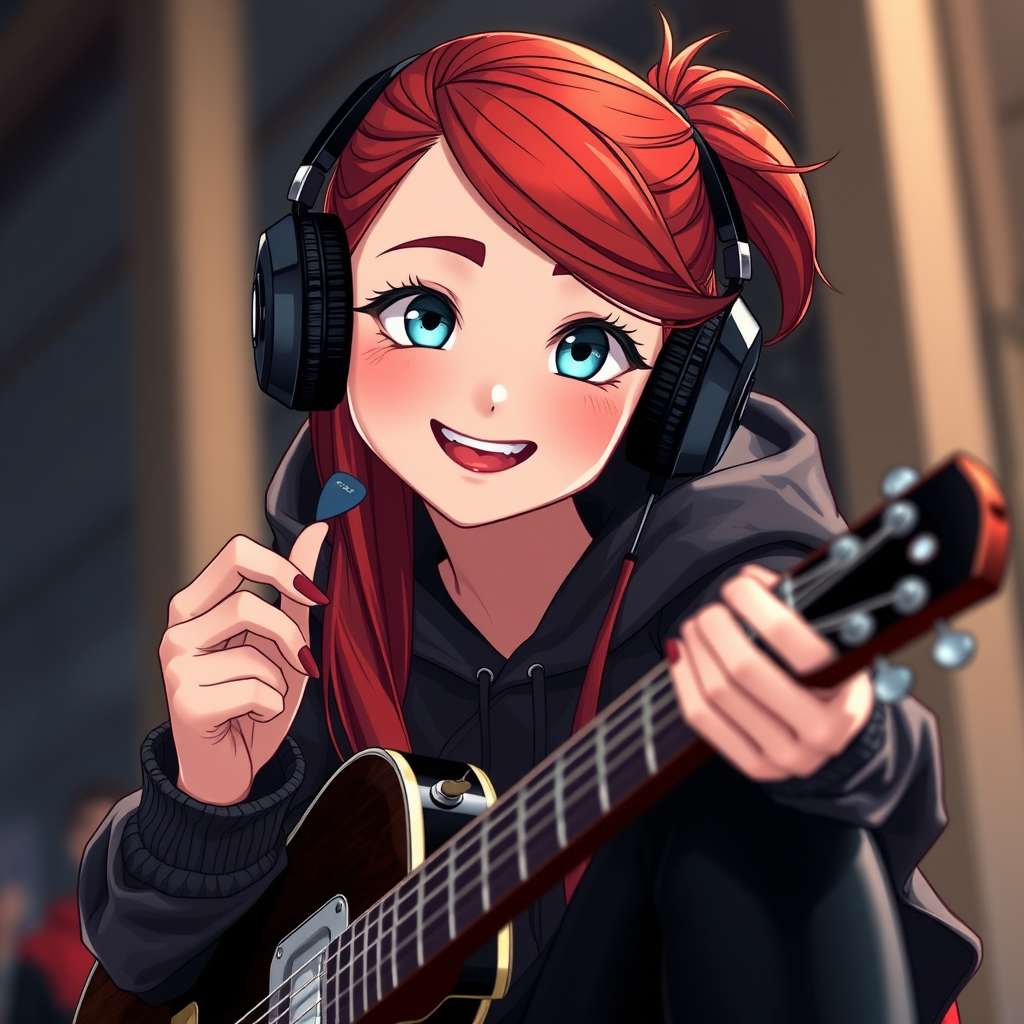 Photo of a single girl, playfully engaging with the camera, exuding a charming smile, infused with hyper-detail, set against a softly blurred background with dramatic lighting to accentuate intricate design elements, showcasing the best quality and high contrast. The scene features her in a solo pose, clad in sleek black pants and a casual hoody, her striking blue eyes hinting at a story untold. She's wearing headphones and holding a guitar plectrum in one hand, the other gently strumming an instrument, her long red hair styled up on one side. Captured at a dynamic angle in a cowboy shot style, her red lips draw an intriguing contrast against her animated, cartoon-like Asian features.