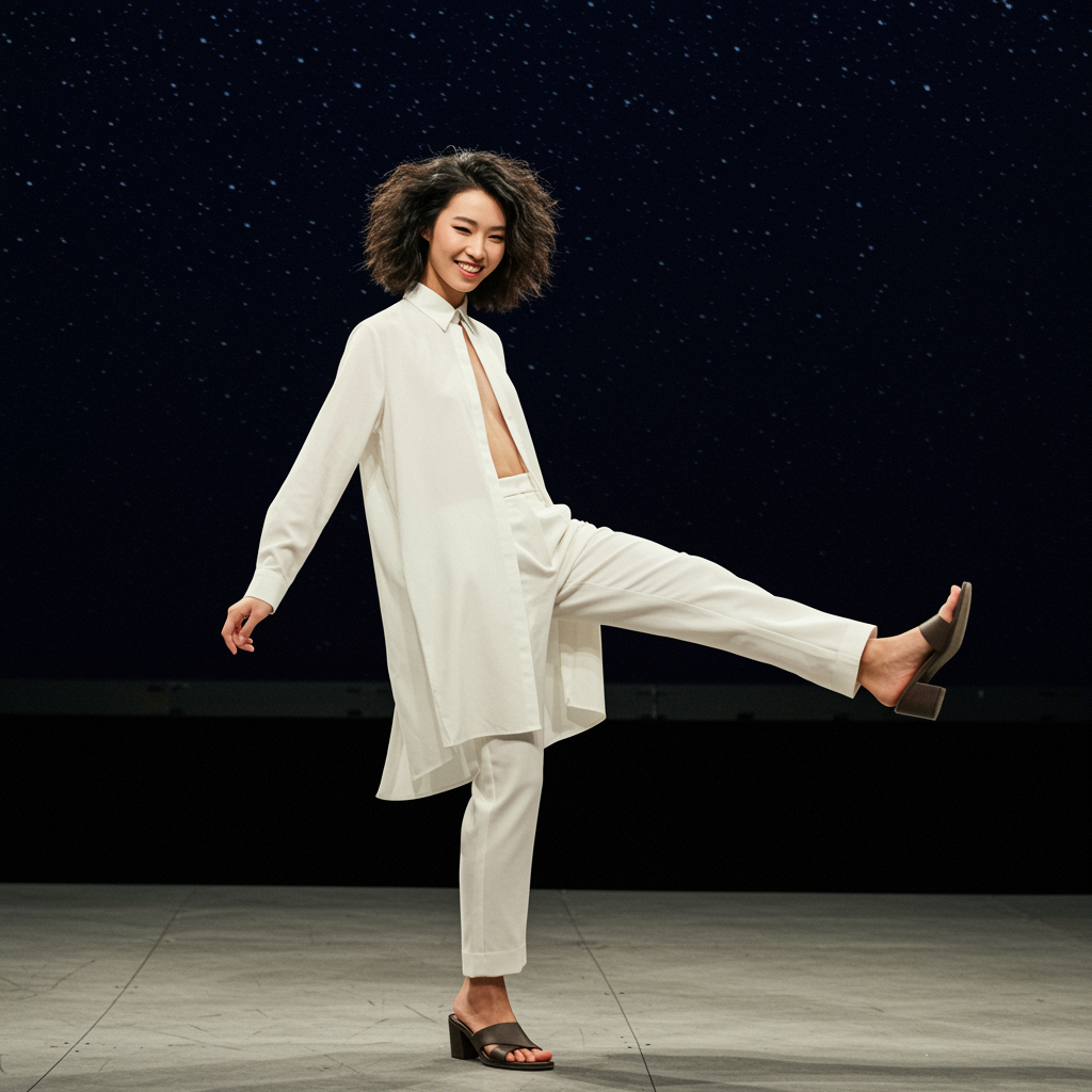 Photo of a slender, youthful Asian female supermodel with small breasts and a flat chest, short tousled black hair, wearing a stark white, collarless tunic that reveals midriff, paired with modernist tapered trousers. She playfully kicks a leg up behind her. The scene uses the rule of thirds and features a Bauhaus-inspired theater stage background under a minimalist starry sky. The model is illuminated by gentle, natural lighting.