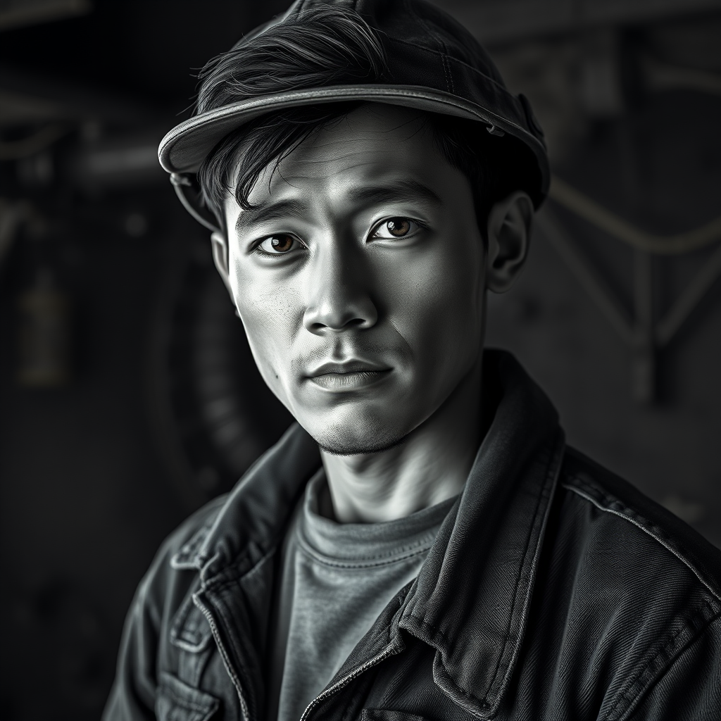 Photo of a stunning artwork depicting a man in a mesmerizing blend of real-world mechanics and fantastic scenery. He stands in a rugged and challenging work environment, captured in a full-body 8k unity render action shot. The scene showcases an exquisite level of detail, from the worker's skin pores and intricately designed iris to the dramatic dark lighting and heavy shadows. The facial features are intensely detailed, creating a striking digital painting utilizing Octane render. With influences from Artgerm, WLOP, and Ilya Kuvshinov, the artwork combines concept art, smooth textures, and sharp focus. The subject, an Asian man rendered in 3D and black and white, dons denim attire. This piece goes beyond the ordinary by delivering a vivid, high-quality portrayal devoid of any imperfections like low resolution or poor cropping.