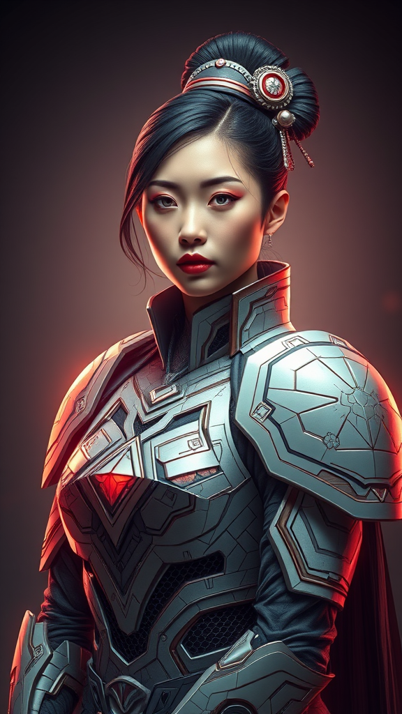 Photo of a stunning Japanese woman in a futuristic space soldier attire, exuding elegance with intricate and detailed fantasy armor, inspired by geometric patterns. The image captures the essence of a masterpiece with ultra high resolution, showcasing a harmonious blend of styles akin to Greg Rutkowski and Alphonse Mucha. Soft gradient lighting accentuates the artwork, adding depth and a touch of ethereal beauty to the scene.