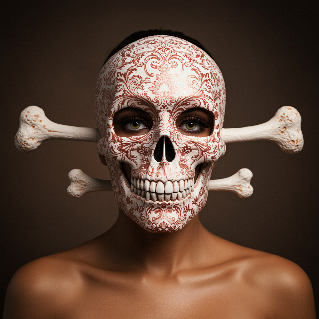 Photo of a woman wearing a surreal skull and bone mask with intricate rose gold and white patterns, looking directly at the camera in a fashion editorial style. The imagery is imbued with dreamy symbolism and celestialpunk elements, featuring baroque-inspired details against her tan skin. The photograph captures ultra-fine details with a Canon 50mm 1.2L lens, embodying a raw and stylized essence with a hint of ethereal sophistication.