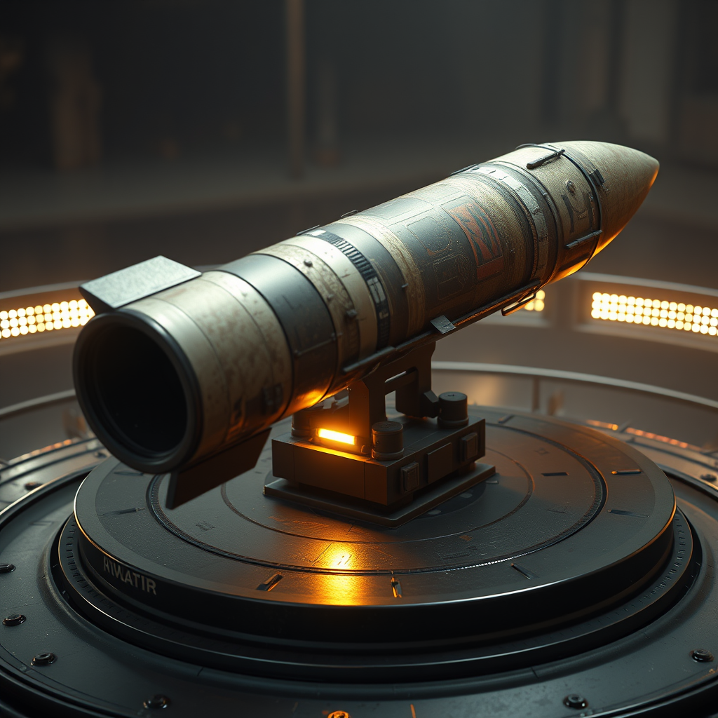 Photo of an ultra-realistic missile on a rotating platform, illuminated by intense, cinematic lighting, featuring a weathered surface; the image is captured from a low angle, showcasing a trending masterpiece on ArtStation in 8k ultra HD. The artwork is hyper-realistic and meticulously focused, highlighting extreme details rendered in Unreal Engine 5. It embodies a cinematic masterpiece, with inspiration drawn from Studio Ghibli’s storytelling and enriched by John William Turner’s intricate artistry, offering a dynamic visual with slight creative embellishments.