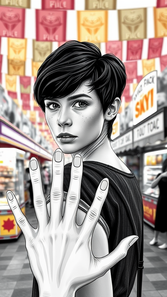 Photo of Daisy Ridley at an amusement park, looking at the camera with short dark hair. Surrounding her are merchant stalls selling vibrant food and souvenirs, with colorful banners over wide walkways creating a lively atmosphere. The image captures an award-winning moment with professional portrait photography elements, showcasing sharp focus and dramatic lighting inspired by artists like WLOP, Jeffrey Simpson, Antonio J. Manzanedo, and Greg Rutkowski. Portrait features include an illustration with depth of field, a slightly stern expression, and stylized shading. In a whimsical twist, there's a depiction of six fingers on one hand, adding an artistic flair. The scene is captured in a monochrome style, enhancing the classic amusement park vibe, though elements like blurred backgrounds and intentionally displaced objects create a dreamlike effect, emphasizing the imaginative and transformed experience.