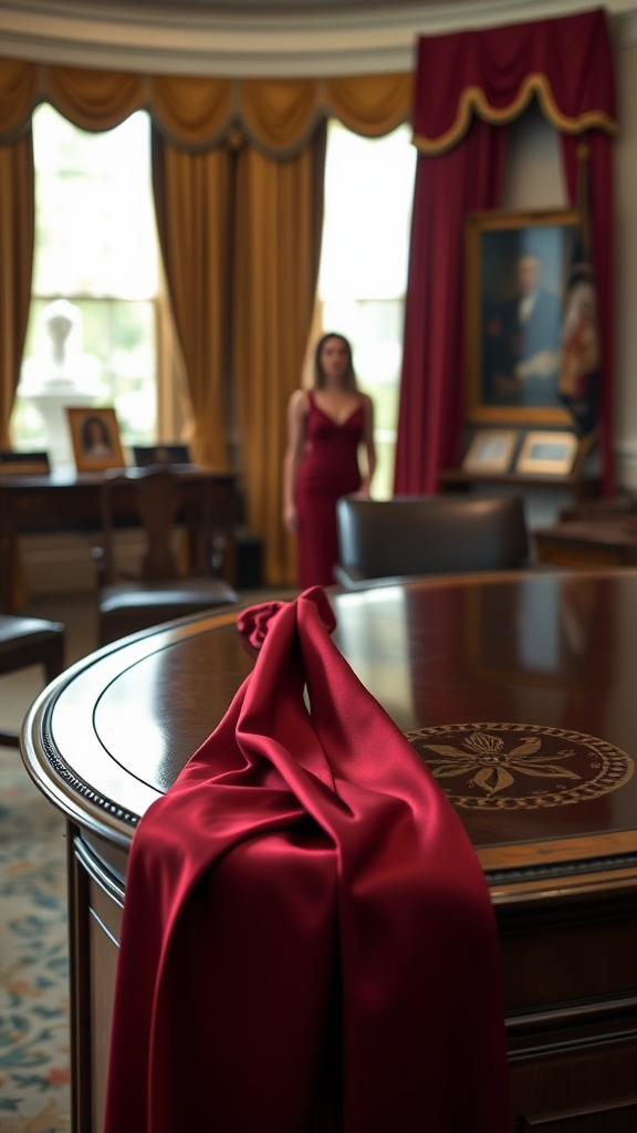 photo of elegant crimson dress draped artfully over the edge of a stately mahogany desk, surrounded by the iconic white house oval office interior, enhanced with soft, natural lighting at f2.8, evoking a sense of intrigue and sophistication, woman subtly framed in the background.