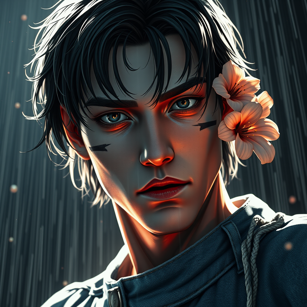 Photo of the most captivating artwork depicting a radiant male protagonist, full-body 8k unity render in an action shot with visible skin pores, enveloped in very dark lighting with heavy shadows. The scene highlights a detailed face with an air of decadence, embodying a digital painting style reminiscent of Artgerm, WLOP, Ilya Kuvshinov, Greg Rutkowski, and Alphonse Mucha. Enhanced by heavy rain, floating particles, dim illumination with trim light, and two-tone lighting, the image includes elements such as flowers and facial markings. The character wears blue jeans, designed in a 3D render style with a smooth, sharp focus illustration. The monochrome setting, accompanied by blur and haze effects, is clarified through asymmetric eyes, and avoids bad anatomy or disproportion, eliminating ambiguity through high resolution.