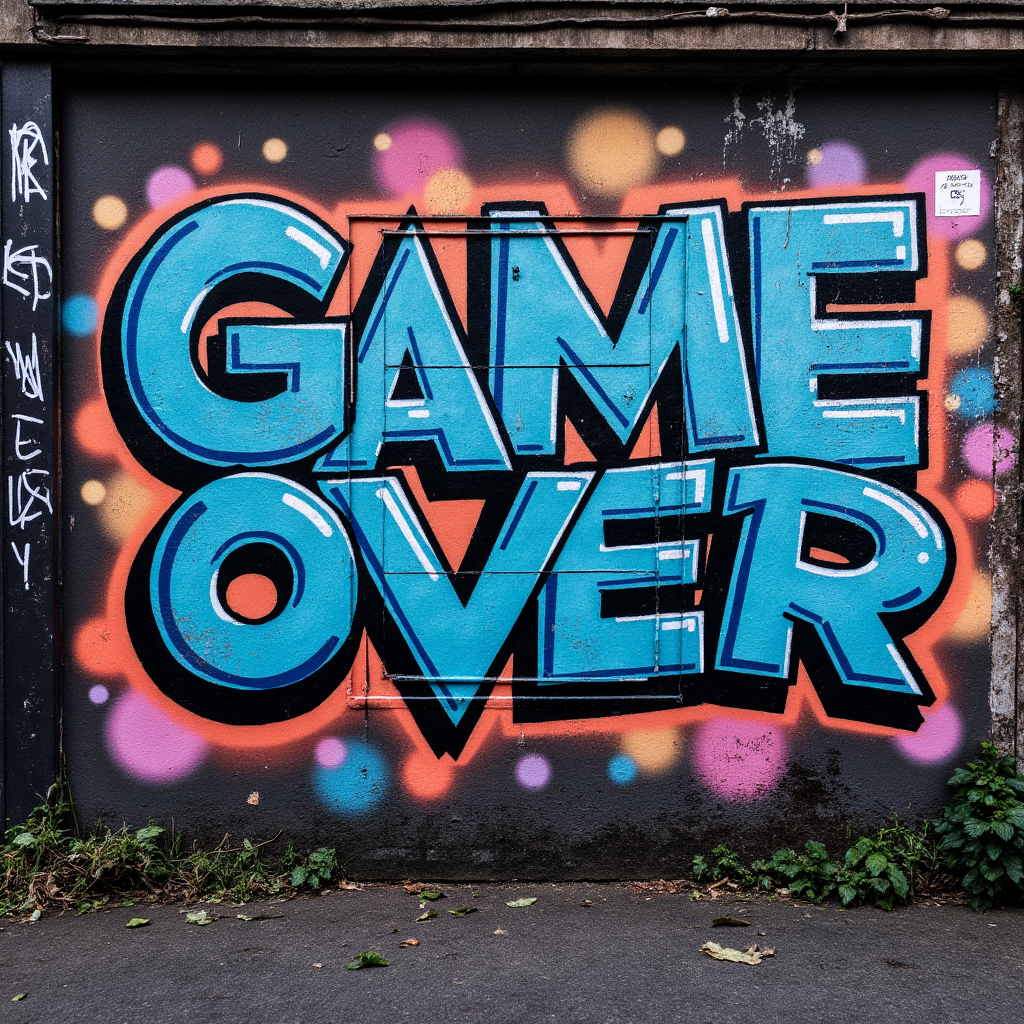 Photo of vibrant wall covered in dark graffiti "Game Over". Probably taken from a phone.