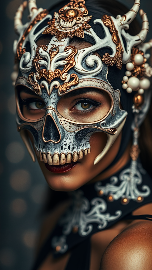 Photo portrait of a woman adorned in a skeleton mask with intricate skull and bone design, featuring rose gold and white accents, gazing directly at the camera. The composition is reminiscent of a vogue-style shoot, infused with dreamy symbolism and celestialpunk elements. The baroque-inspired patterns add a touch of opulence, complementing her tan skin. Captured in a fashion editorial style with a Canon 50mm f/1.2L lens, showcasing ultra-fine details and a raw aesthetic. The scene is enhanced with hints of a shimmering starlit background, evoking an ethereal and otherworldly atmosphere.