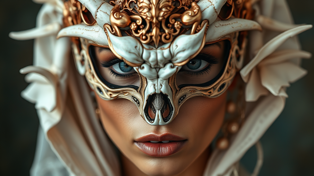 Photo portrait of a woman adorned with an intricate skull and bone mask, hues of rose gold intertwining with white, gazing directly at the camera with an ethereal expression, embodying dreamy symbolism. The style merges celestialpunk with baroque-inspired elements, highlighting her tan skin in a high fashion editorial setting. Captured with the precision of a Canon 50mm 1.2L lens, the image boasts ultra-fine details, set in an artistic raw style with a touch of fantasy and elegance.