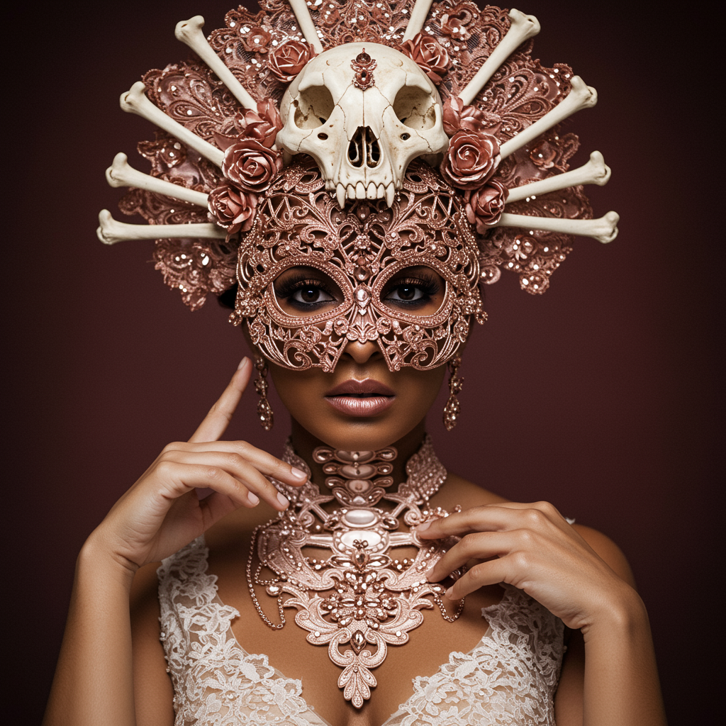 Photo portrait of a woman adorned with an intricate skull and bone mask, styled in rose gold and ivory hues, gazing directly at the camera with a vogue-like elegance. The imagery evokes a sense of ethereal symbolism and celestial fantasy, with baroque-inspired embellishments. Her warm tan complexion enhances the fashion-forward editorial atmosphere, captured with a Canon 50mm 1.2L lens, emphasizing ultra-fine details.