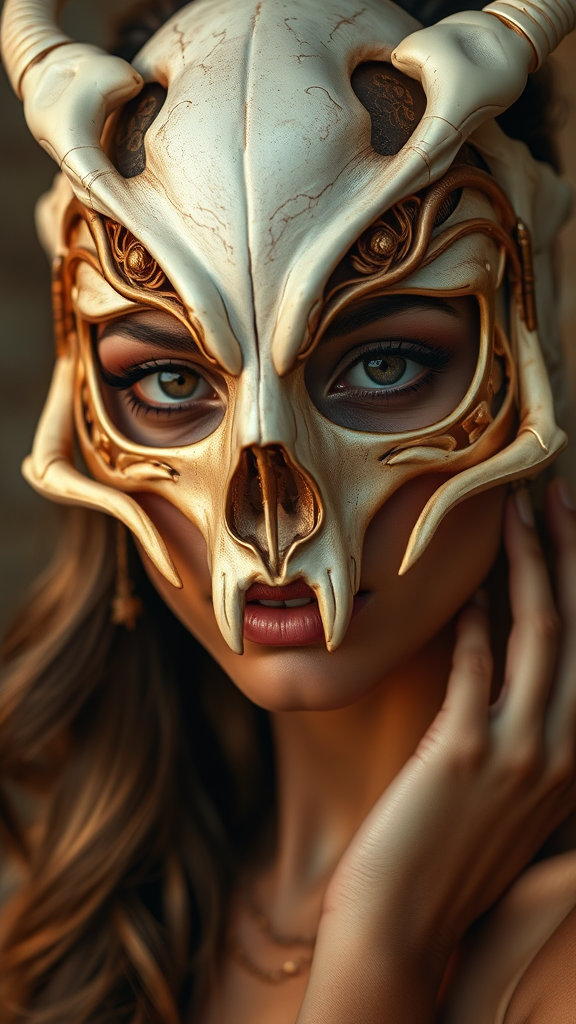 Photo portrait of a woman in a skull and bone mask with rose gold and ivory hues, gazing directly at the camera, featuring a Vogue-inspired composition and a touch of ethereal symbolism. Embodying celestialpunk aesthetics with baroque-inspired elements, her tan skin adds warmth to the scene, resembling a high-fashion editorial. Captured with ultra details using a Canon 50mm lens, the image has a raw yet stylized quality, enhanced by elegant textures and delicate contrasts.