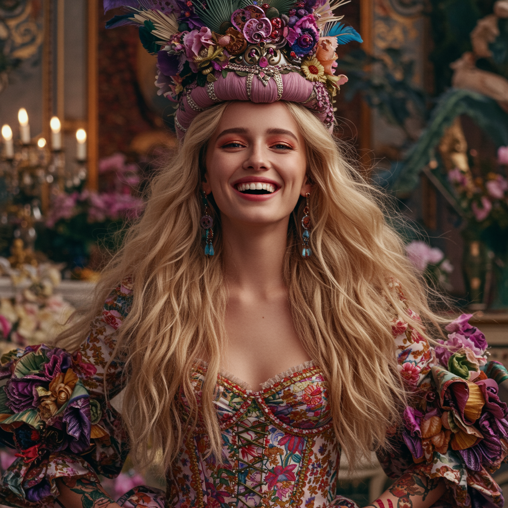 A commercial photo portrait of an Instagram swimwear fashion model, a smiling blonde with flowing long hair, dressed in a glossy, vibrant outfit that fuses rococo and dieselpunk elements. The image captures her in a hyper-realistic, detailed scene with an air of majestic luxury, emphasizing organic designs with intricate details. Shot in 32K UHD using a Canon EOS R5 with a Canon EF 85mm f/1.2L II USM lens, the composition exudes an elite, photorealistic quality, subtly modified to capture the essence of effortless chic and elegance in a dreamy, vivid setting.