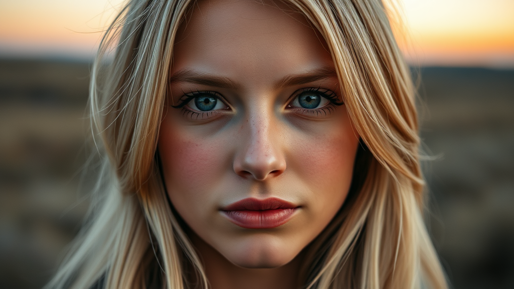 Photo realistic portrait of a stunning Scandinavian girl, medium blonde hair, captured at dusk, showing a detailed and intricate face with a sharp, focused expression, enhanced depth of field, symmetrical features, shot with a shallow f/1.8 aperture on an 85mm lens using a Nikon Z9, ensuring clarity and precision without anatomical errors or distortions.