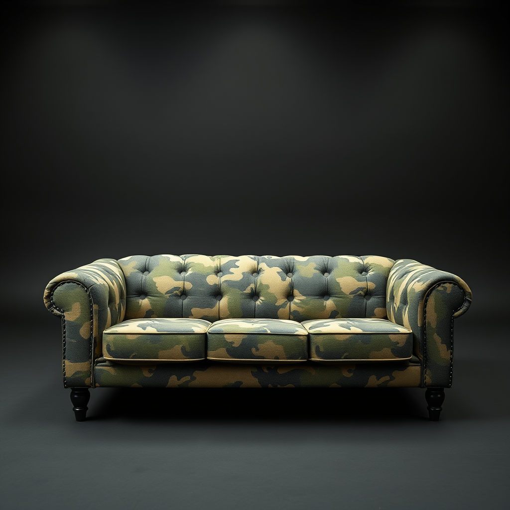 Photograph a small couch with a camouflage texture and black steel detailing, captured front view, using a Sony α7R IV with a Sony FE 24-70mm f/2.8 GM lens set to f/8 for optimal sharpness. Utilize a shutter speed of 1/125 to freeze the image, maintaining ISO at 100 for fine image quality. Focus on capturing every detail, from light patterns to material textures, in a professional manner. Set in a photo studio with a low hue, solid background featuring black and white high contrast highlights. Incorporate realism with sunlight and softbox lighting to achieve sharp focus and clear, detailed imagery. Maintain a cinematic, glamorous appearance with UHD resolution, emphasizing a 9:16 aspect ratio and raw style with a stylized touch.
