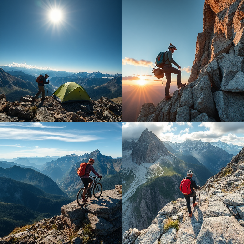Photograph a variety of outdoor adventures like hiking, camping, mountain biking, and rock climbing, capturing the thrill and stunning beauty of these activities in breathtaking natural environments. Utilize a versatile FE 24-105mm f/4 G OSS lens to achieve exceptional image quality, sharpness, and vibrant color rendition. Adjust camera settings to include an aperture of f/5.6 for a balanced depth of field, an ISO of 200 for optimal clarity, and a shutter speed of 1/250 sec to perfectly freeze the action and convey the dynamic energy of the moment.