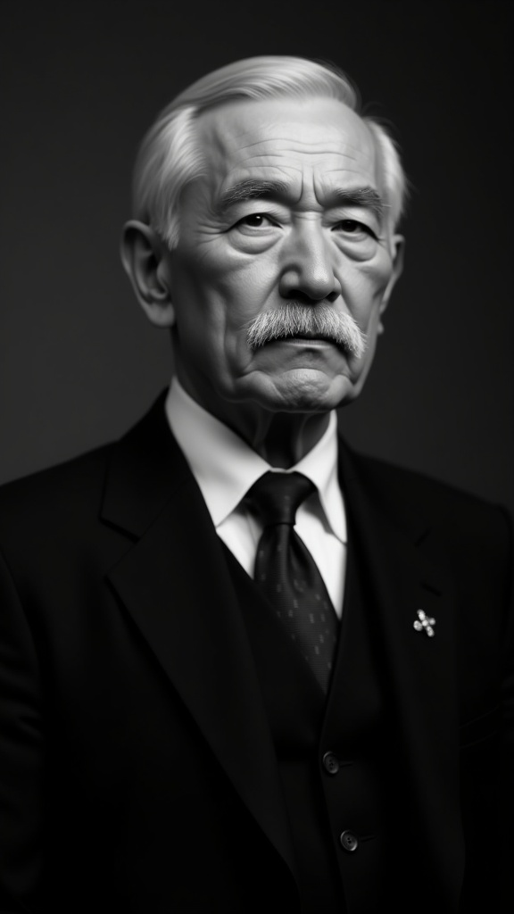 A digital photograph captures a middle-aged to elderly man, aged between late 40s and 60s, in a formal portrait that is both photorealistic and high-resolution. The image focuses sharply on the subject's face with an emphasis on clarity and detail, presenting a timeless quality. Soft, even lighting from the front-left creates gentle highlights on his forehead, cheekbones, and the top of his hair, while subtle shadows on the right contour his face delicately. The photograph exhibits a shallow to moderate depth of field, keeping the man's face and upper body in sharp focus against a softly blurred background. The monochromatic color palette ranges from deep blacks in the suit and bright whites in the hair and shirt collar to a rich spectrum of mid-grays, adding depth and texture. The subject appears serious and deeply contemplative, with a direct, intelligent gaze. His oval to slightly rectangular face features a broad forehead and a prominent jawline. His hair, light-colored to appear white or very light gray, is neatly combed and parted on the left, displaying a slight wave or volume. His eyes, light-colored and almond-shaped, are deep-set beneath well-defined eyelids. Medium-thick eyebrows, matching the hair's light color, sit straight above a straight, prominent nose. The hidden lips are mostly covered by a thick mustache that extends horizontally beyond the corners of his mouth, while a broad, rounded chin with a slight cleft adds to his dignified appearance. In the portrait, the man poses with his upper body angled slightly to the right, head turned to look directly at the viewer, conveying an upright and formal demeanor. He wears a dark, possibly woolen suit jacket over a light-colored collared shirt, accentuated by a dark, perhaps patterned necktie fastened with a decorative tie pin. A dark waistcoat may be partially visible beneath the jacket. The background is a plain, solid medium gray or dark neutral tone, uniformly lit to focus attention on the subject. The overall mood is formal, dignified, and intellectual, evoking a sense of authority and an academic presence.