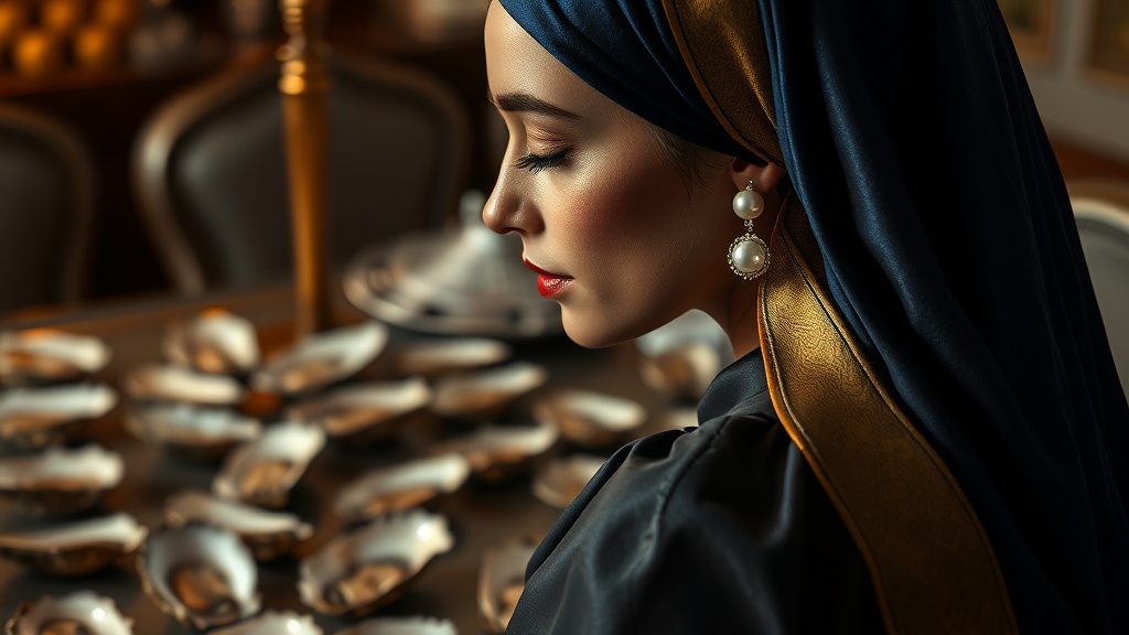 A hyper-realistic photograph captures a serene scene at a table adorned with oysters, shot with cinematic lighting using a 50mm lens. The focal point is a sei-gwpe, elegantly posed, wearing a shimmering pearl earring that catches the light. The figure is draped in a luxurious deep blue and gold headscarf, which cascades softly around their shoulders, adding a touch of regal sophistication to the atmosphere. The surface of the table glistens subtly, enhancing the richness and texture of the composition in stunning 4k resolution.