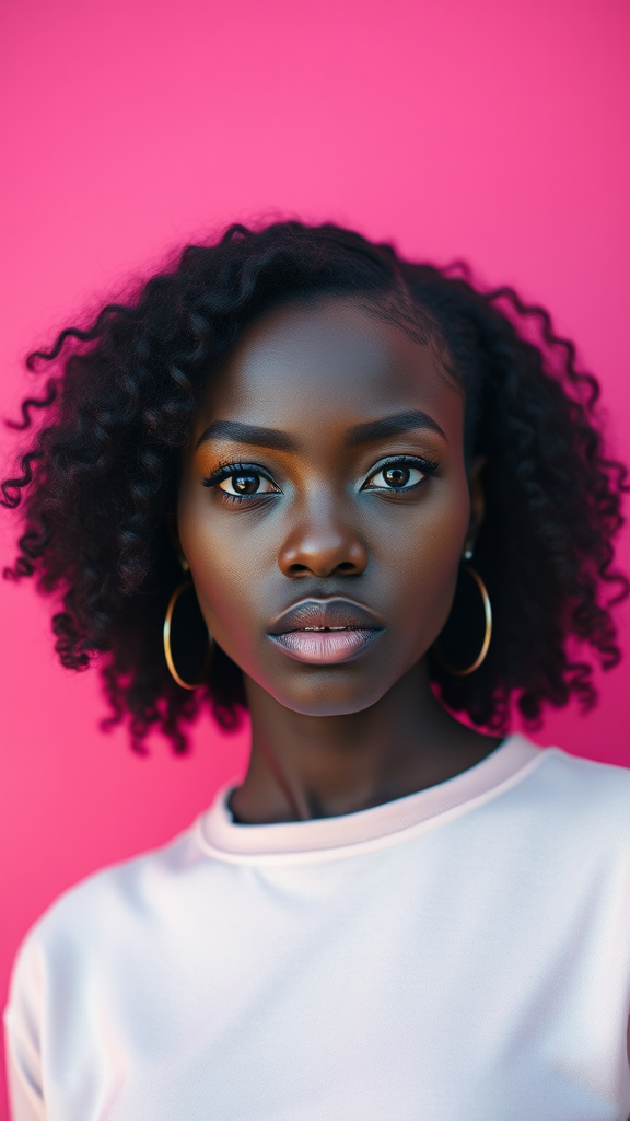Photograph capturing a black woman model against a vibrant hot pink background, her stylish eyes marked by subtle detailing. Shot with a camera setup emulating a large aperture at f/1.4, the image draws focus on the model while blending her surroundings into a smooth blur, maintaining a raw and natural aesthetic.