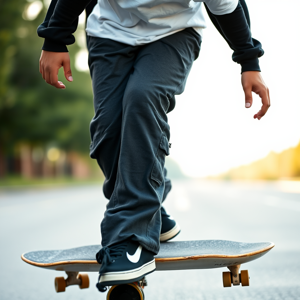 Photograph capturing a candid moment: a young boy and his father are joyfully balanced on a skateboard. The boy, in a relaxed white T-shirt exuding a playful yet cool charm, pairs it with dark grey cargo joggers. Their shared adventure centers around the boy holding onto his father's sturdy, tattooed hands. Only the father's lower body is in view, dressed in black, loose-fit long sleeves, suggesting a story of comfort and style. Both wear Nike SB skateboard shoes, contrasting in their stories of wear—one set new, the other comfortably worn-in. This scene is bathed in the soft, natural light of a serene setting, skillfully captured with a Sony α9 II using a Sony FE 100-400mm f/4.5-5.6 GM OSS lens. The image is suffused with a high-contrast effect, celebrating the perfect face-to-body ratio and the shared happiness bridging generations through a creative lens.