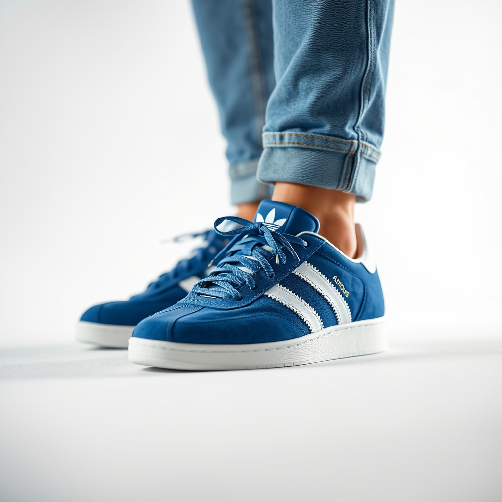 Photograph capturing a detailed close-up of Adidas blue suede sneakers with white accents, utilizing a Sony A7R IV camera paired with a FE 50mm f/1.2 GM lens. The composition features a softly blurred (out-focused) effect against a pristine white backdrop, emphasizing a realistic lighting setup with heightened contrast. The image focuses on ultra-high definition (UHD) details and hyper-resolution clarity, presented in a portrait orientation with a natural, unfiltered style and a hint of artistic subtlety.
