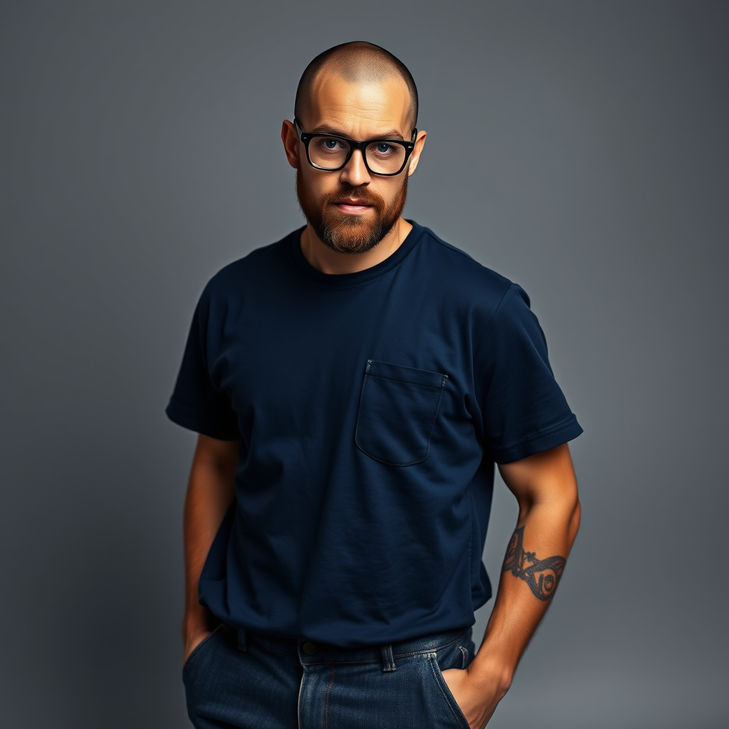 Photograph capturing a professional male model with a charismatic presence; he has shaved hair, a neat beard, and wears stylish horn-rimmed glasses. The setting is a photo studio with a solid grey background, emphasizing the model's striking features as he gazes intently into the camera. His forehead displays subtle wrinkles, enhancing the portrait's character in a style reminiscent of Richard Avedon's work. The photograph is taken using the Sony α9 II camera paired with the Sony FE 100-400mm f/4.5-5.6 GM OSS lens, ensuring crystal clear details. He is dressed in a loose-fitting XL T-shirt in a deep, dark blue color, featuring a minimalist logo on a large left chest pocket. The look is complemented by deep-wash denim jogger pants with a minimalistic innovative design, revealing a distinguished tattoo on his arm. The photography expresses a classic yet modern aesthetic, with high contrast and a raw, stylized appearance. The overall composition avoids unfinished forms, awkward poses, strange tags, logos, typos, and maintains realism with a focused gaze, resulting in a striking and authentic visual presentation.