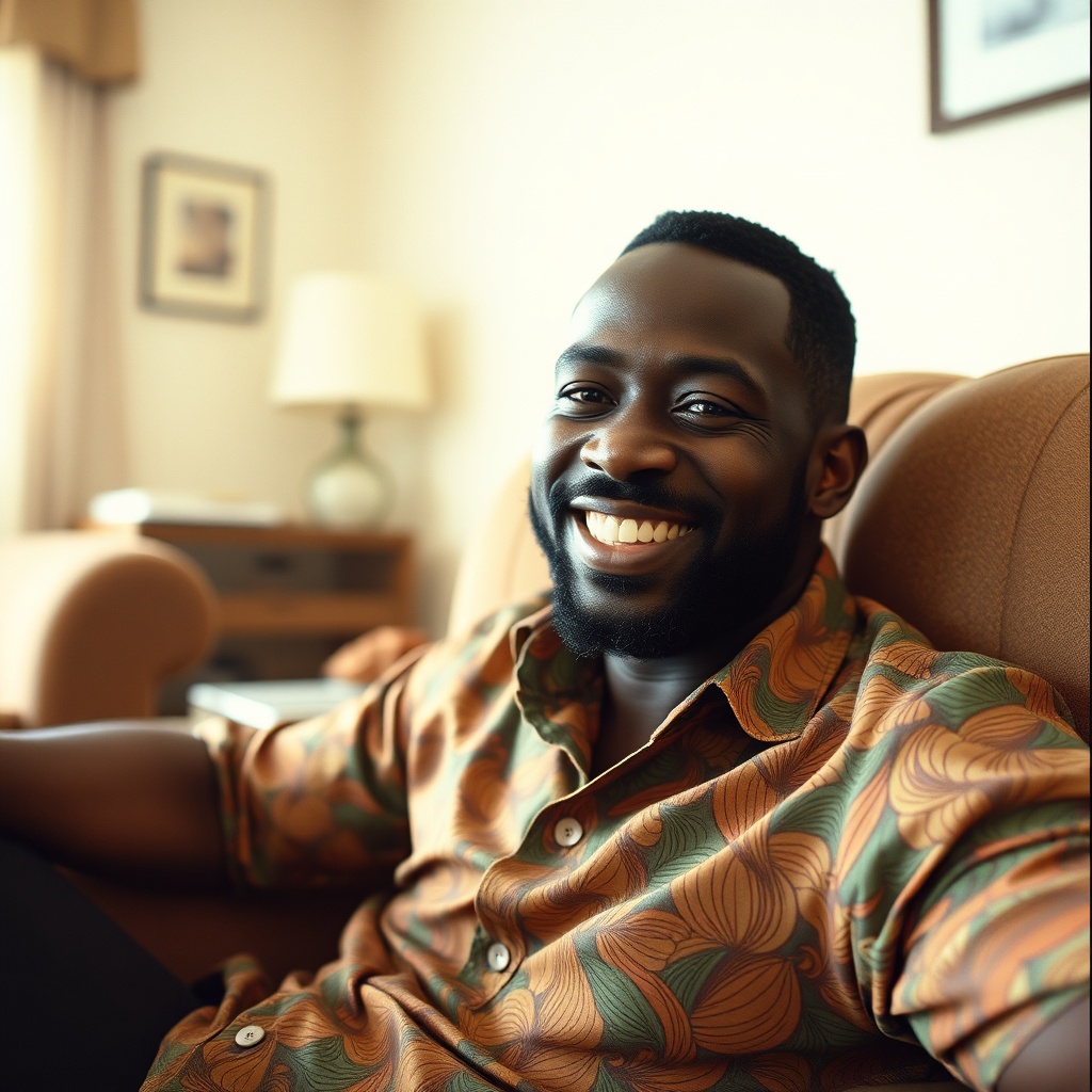 A vintage photograph capturing an African American man with a neatly trimmed beard and short hair, wearing a vibrant, patterned shirt as he relaxes on the plush carpet of his living room. The soft, natural light filters through the room, highlighting the gentle imperfections that add to his unique charm. He's gazing warmly at the camera with a genuine smile that lights up his face. The setting hints at the early eighties with hints of retro decor subtly present in the background.